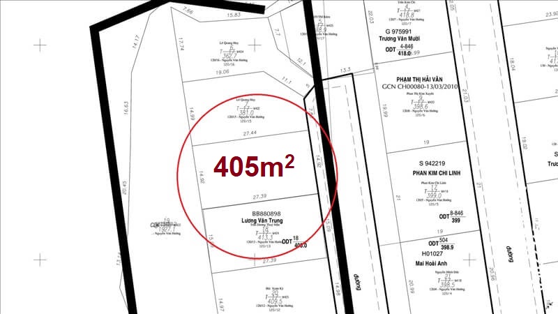 + Diện tích ngoài lộ giới 308m². Diện tích khuôn viên thực tế rộng 360m². Diện tích công nhận trên sổ (cũ) 276m² (ngang 13,2m x dài 27,4m)