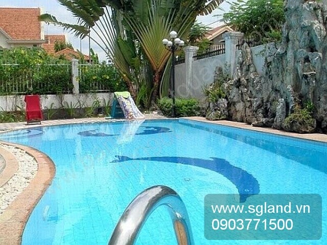 - Hồ bơi lớn với các fountains tượng đá phun nước bằng cẩm thạch trắng phong cách Ý sang trọng, sân vườn chung quanh, giả sơn có thác nước chạy suốt tường thành bao bọc rất kín đáo, đèn pha bơi đêm.